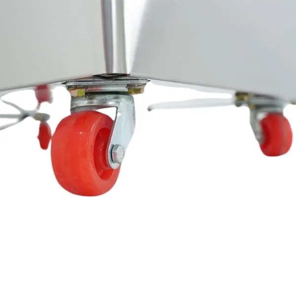 Toàn bộ vỏ máy làm từ inox, bền, dễ vệ sinh và phù hợp môi trường chế biến thực phẩm. Máy cũng có bánh xe di chuyển để thuận tiện bố trí.