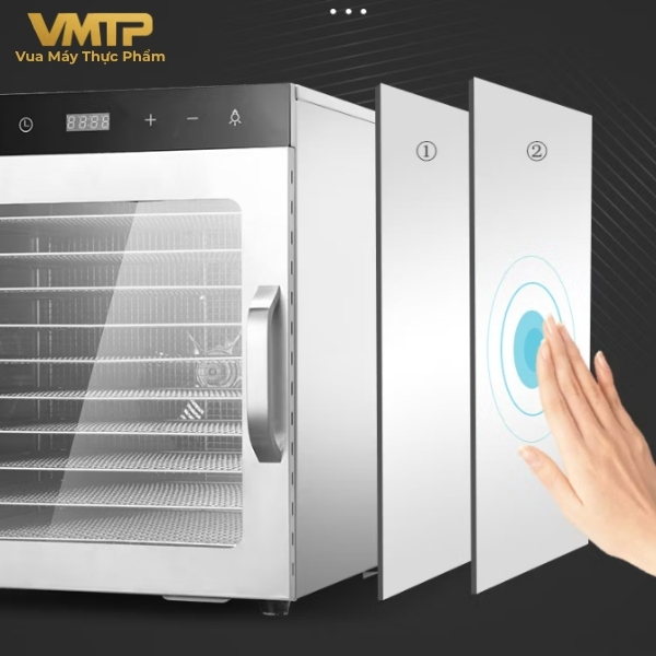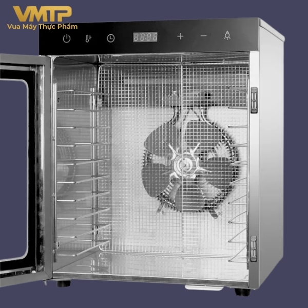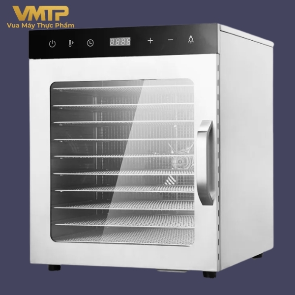 Máy trang bị 10 khay inox giúp sấy được nhiều thực phẩm cùng lúc, phù hợp cho gia đình hoặc kinh doanh nhỏ.