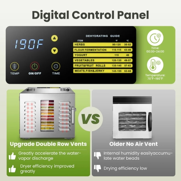 Dải nhiệt 20℃ đến 90℃ linh hoạt cho sấy khô trái cây, rau củ, thảo mộc, hoặc các loại thịt jerky theo nhu cầu.